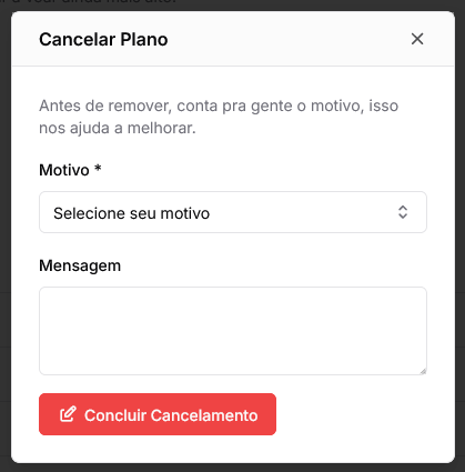 Antes de finalizar, selecione o motivo do cancelamento e, se desejar, compartilhe conosco um feedback.