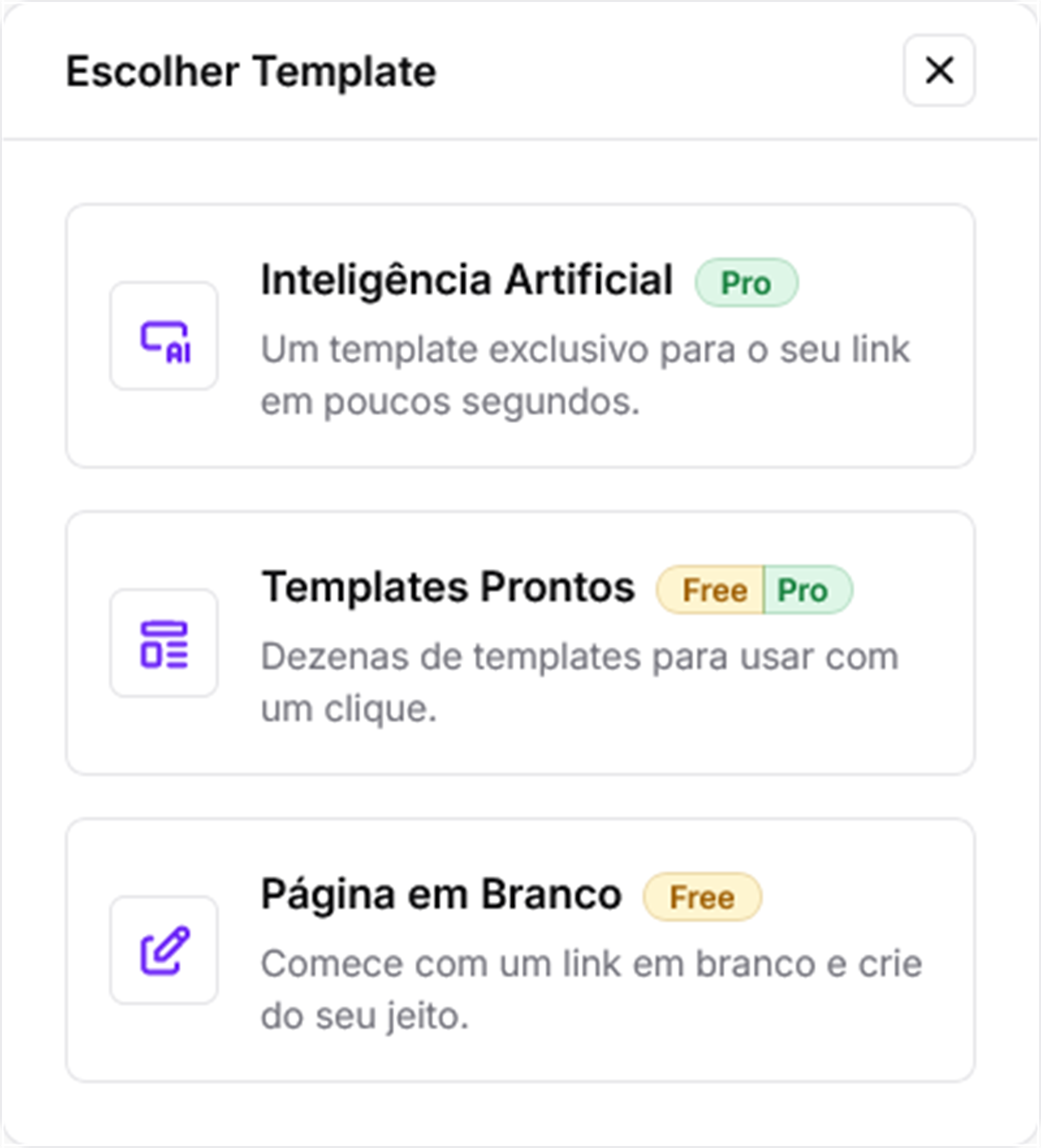 O próximo passo é a escolha do template, você será direcionado para a tela de Escolher Template, onde deverá escolher um template para ser utilizado na criação do seu link.