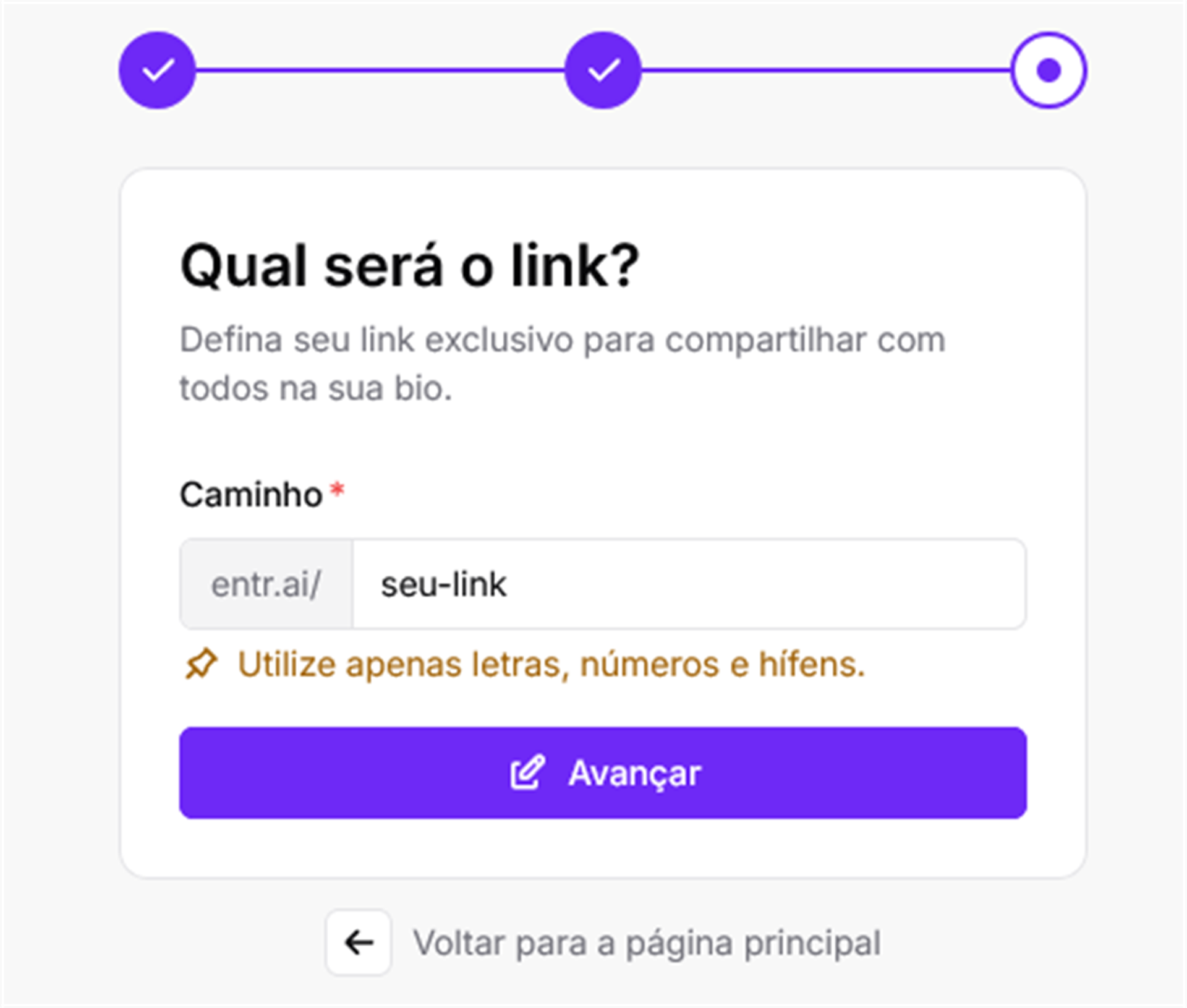 Se esse for o seu primeiro link, ao entrar no painel você será direcionado para completar os passos a seguir.