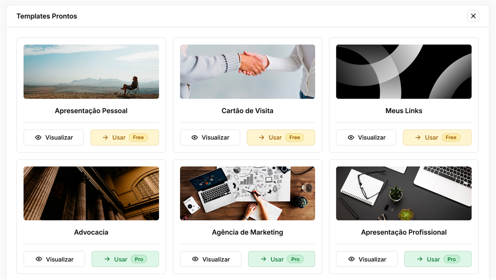Você será direcionado para a página com a lista de todos os templates prontos, dos planos Free e Pro.