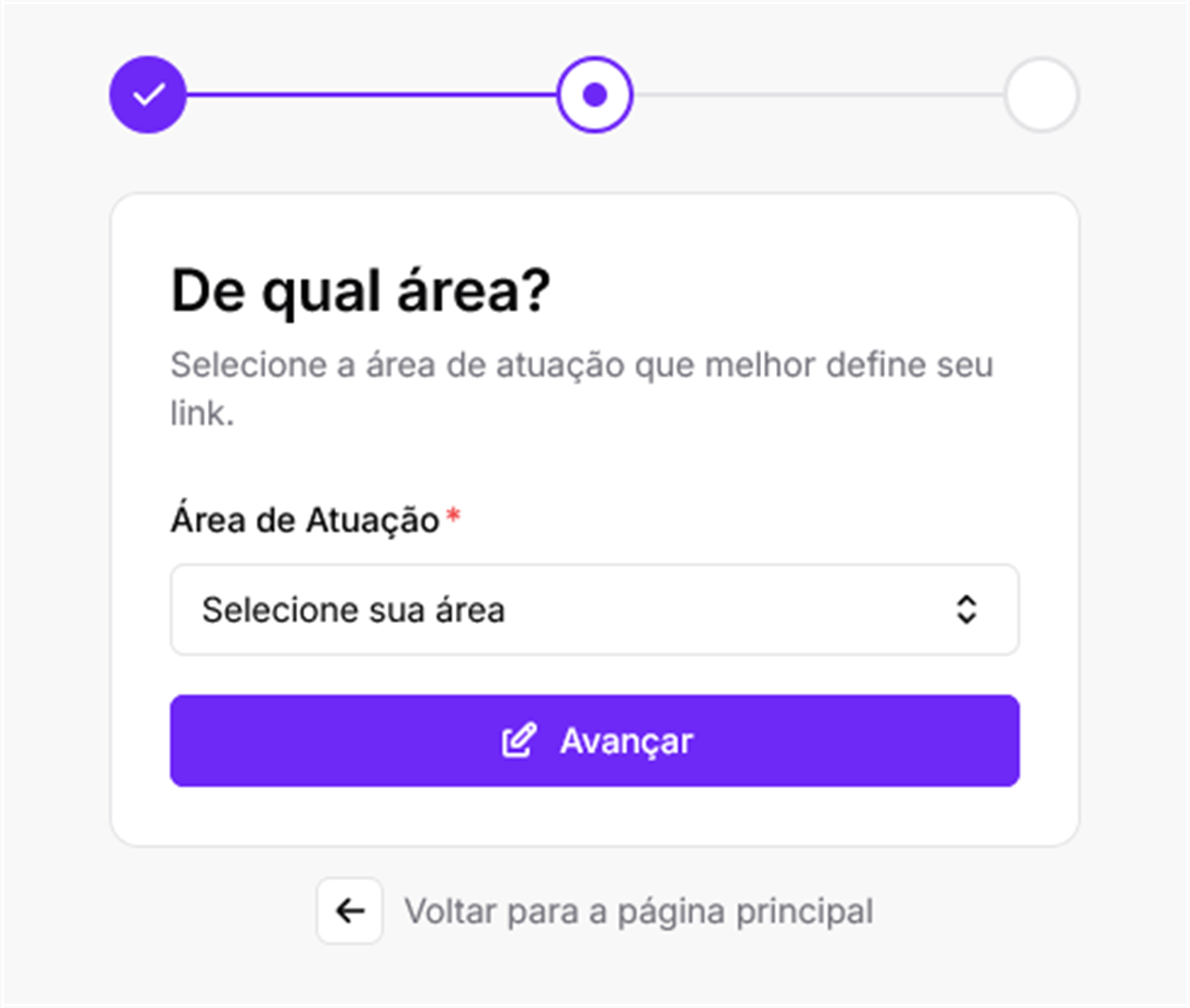 O segundo passo é selecionar a Área de Atuação do seu link.