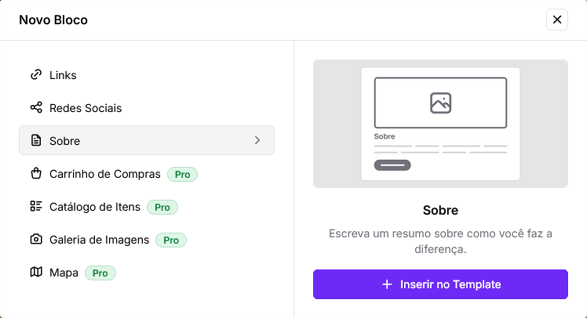 Com o bloco Sobre você pode escrever um resumo sobre você ou seu negócio e como ele faz a diferença. Esse bloco está disponível nas versões Free e Pro.