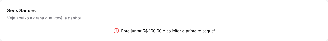 Você poderá solicitar um saque sempre que atingir R$ 100,00 no campo Disponível. O pagamento será realizado via Pix em até 5 dias úteis, todo o processo é automatizado.
