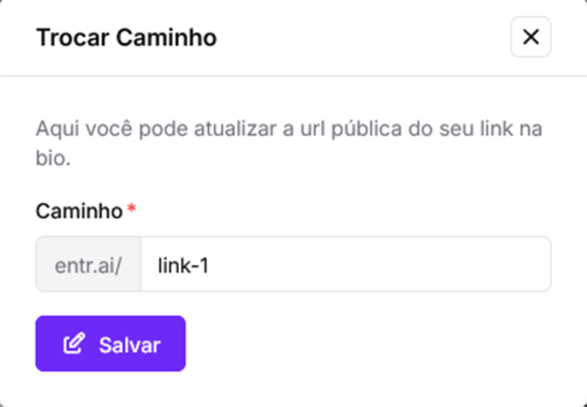 Lembre-se: o caminho deve conter apenas letras, números e hífens (-). Além disso, ele precisa ser único, ou seja, não pode estar sendo usado por outro link na Entrai.