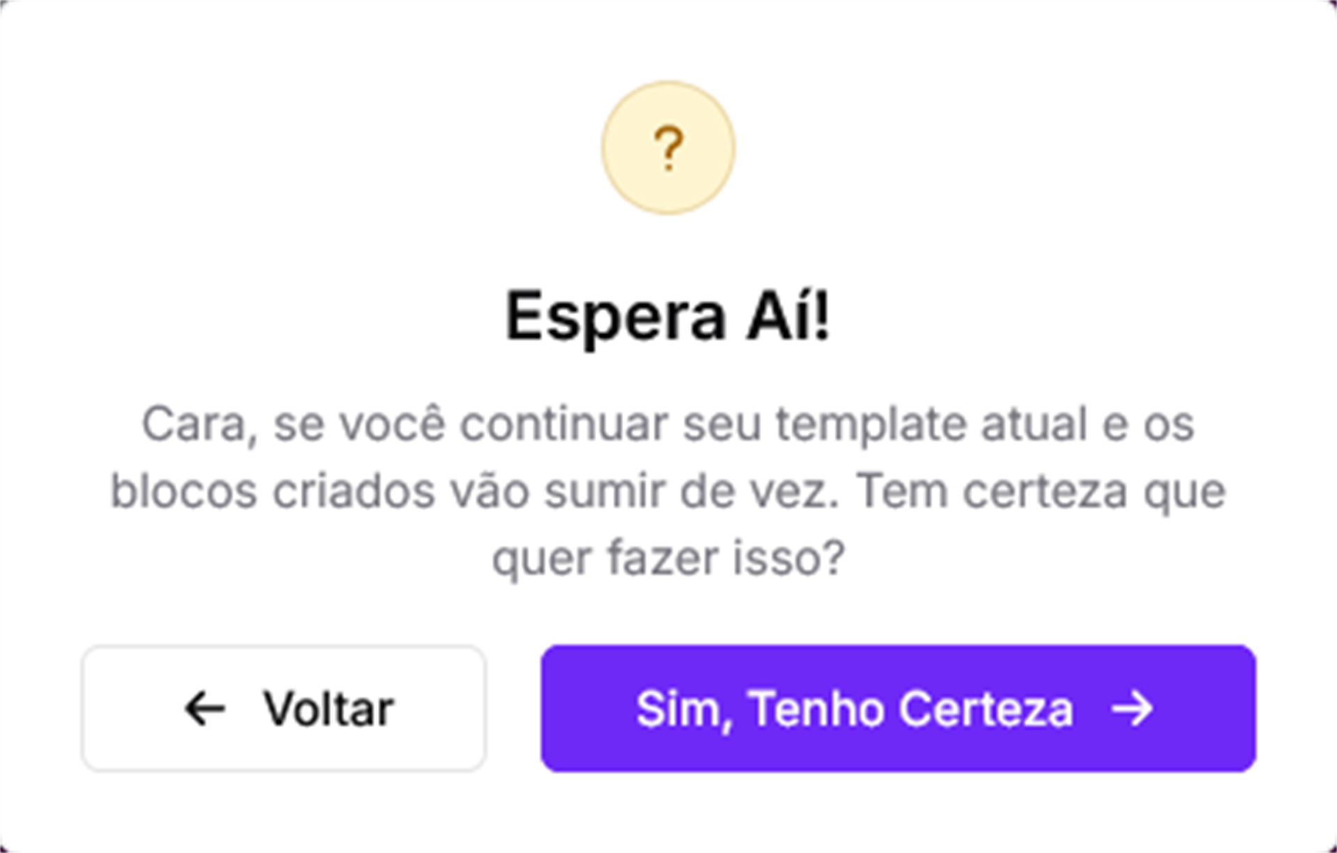 Após confirmar a troca, seu template atual e todos os blocos já criados serão removidos permanentemente, então tome cuidado, essa é uma ação irreversível.